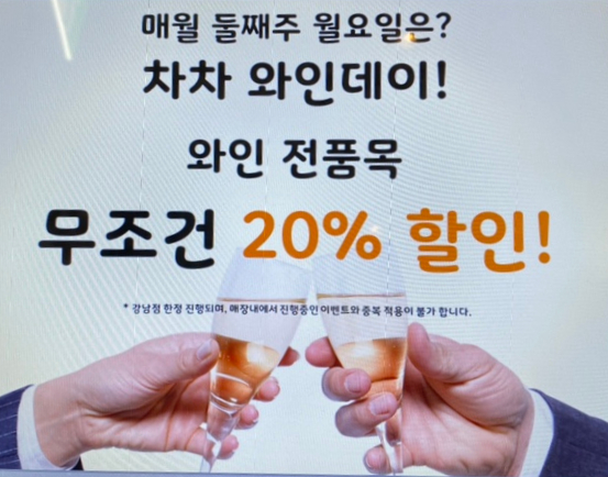 그리고 눈에 띈 차차와인데이! 매월 둘째 주 월요일은 차차 와인데이로 와인 전 품목을 무조건 20% 할인해 준다고 해요😆