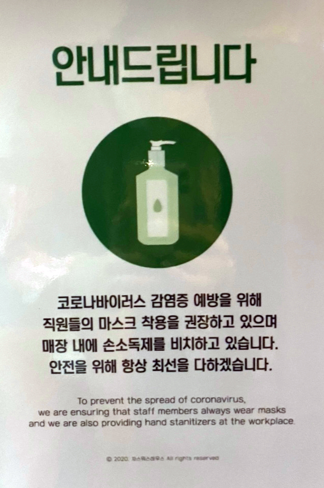 '코로나바이러스 감염증 예방을 위해 직원들의 마스크 착용을 권장하고 있으며 매장 내에 손소독제를 비치하고 있습니다. 안전을 위해 항상 최선을 다하겠습니다'