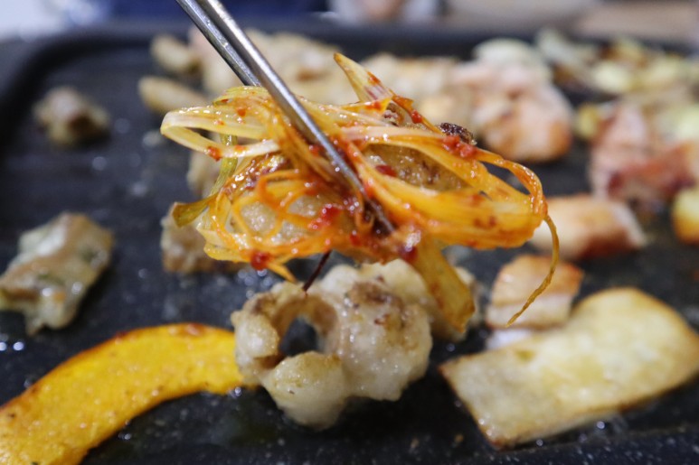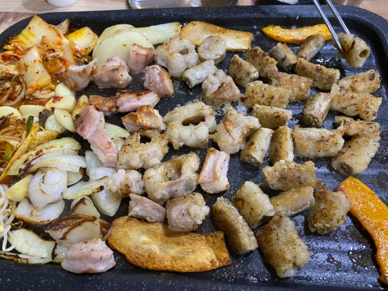 단호박, 곱창, 대창, 막창, 양파, 염통, 감자, 버섯, 콩나물, 마늘, 파채, 김치... 가 모두 불판 위에 있습니다😆 진짜 같이 먹으면 맛있는 거 다 올려주셨어요😆😆