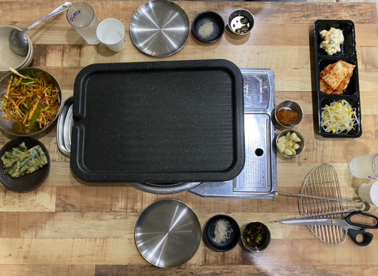 주문하니 불판과 기본 반찬, 소스가 나왔습니다😆